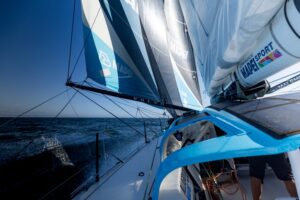 “Biotherm”, primero en llegar a Oporto, fue también el primero en zarpar de nuevo, seguido por “Paprec Arkéa”, “Holcim-PRB” y “Team Malizia”. Su patrón, Paul Meilhat, sabía que su barco estaría en desventaja en esas condiciones, y ya lo había señalado el día anterior: “mi barco se siente menos cómodo en navegación de popa”.