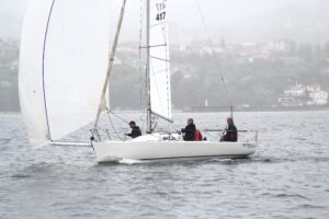 Viento flojo pero suficiente el que tuvieron los participantes en la tarde del sábado día 4 durante la celebración de la 10ª Regata a la Inversa de la Ría de Pontevedra que organizó el Real Club de Mar de Aguete con la colaboración de supermercados Froiz y Marina Puerto de Combarro, con una brisa del sudoeste de entre 6 y 7 nudos de intensidad que duró justo hasta poco más de 10 minutos después de cruzar la línea de llegada el último participante. Eso sí, bajo una pertinaz “poalla” que no arredró a los entusiastas participantes.