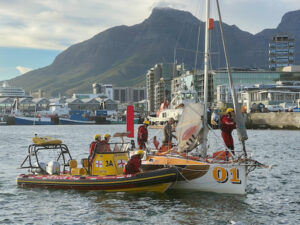 Ertan Beskardes (#01 Trekka / Reino Unido): Tras una elegante navegación nocturna hacia Table Bay, el “TREKKA” cruzó la línea, solo para ser azotado por ráfagas catabáticas de entre 40 y 50 nudos. Su vela mayor se rompió. Arrastró el ancla. En un momento dado, temió por el “TREKKA”, por lo que llamó al NSRI para pedir ayuda en una situación difícil. Respondieron de inmediato y lo remolcaron 4 millas hasta un lugar seguro. Este es el primer rescate de la flota y el MGR se mostró muy agradecido a todos los que participaron, incluida la radio de Ciudad del Cabo.