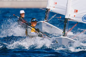 Las primeras regatas fueron para ILCA 7 e ILCA 6, con un viento de unos 15 nudos del Noroeste que mantuvo una intensidad estable a lo largo de la jornada.