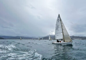 La jornada arrancó en el interior de la bahía de Baiona con un chubasco intenso antes del procedimiento y un viento del oeste que rondaba los 16 nudos. Con estas condiciones se logró montar el campo y dar salida a la primera manga, pero al poco de iniciar la prueba, los J80 vieron cómo se les complicaba la navegación.