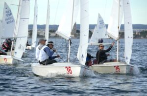 Sobre las 15.00 horas daba la sensación de que sí iba a entrar. Con la flota ya en el agua y con escaso viento de 5-6 nudos sobre un eje del 170º (Sur) se pudo lanzar la primera prueba del día, y la que iba a ser la única. Además de la poca fuerza de Eolo, se añadía la inestabilidad, por lo que ya en la segunda ceñida hubo cambio de recorrido al 195º y bajando en intensidad hasta quedarse en 4-5 nudos, aunque se pudo completar la prueba.