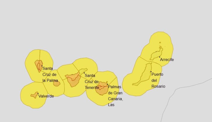 CCAN.: GRAN CANARIA, por Fenómenos Costeros Adversos. LANZAROTE y FUERTEVENTURA (entre 9 y 21h.), por riesgo de Vientos y Fenómenos Costeros Adversos. LA PALMA, por riesgo de Tormentas y Fenómenos Costeros Adversos (a partir 18h.). LA GOMERA, por Fenómenos Costeros Adversos (a partir 12h.). EL HIERRO, por Fenómenos Costeros Adversos. TENERIFE, por riesgo de Vientos (a partir 18h.) y Fenómenos Costeros Adversos.