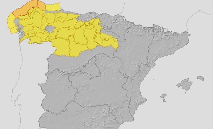 CGAL.: A CORUÑA y LUGO, por riesgo de Vientos (a partir 12h.), Lluvias (a partir 18h.) y Fenómenos Costeros Adversos (hasta 18h.). OURENSE y PONTEVEDRA, por riesgo de Vientos y Lluvias (a partir 18h.).