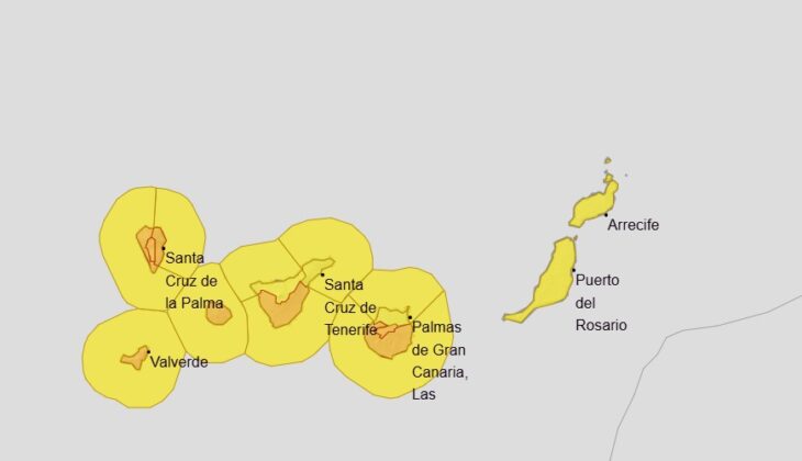 CCAN.: FUERTE VENTURA y LANZAROTE, por riesgo de Vientos y Polvo en Suspensión. GRAN CANARIA, LA PALMA , LA GOMERA , EL HIERRO y TENERIFE, por Fenómenos Costeros Adversos y Polvo en Suspensión.