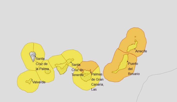 CCAN.: GRAN CANARIA, por riesgo de Vientos (hasta 18h.) y Fenómenos Costeros Adversos (entre 8 y 18h.). LANZAROTE y FUERTEVENTURA, por riesgo de Vientos (hasta 9h.) y Fenómenos Costeros Adversos (hasta 17h.). LA PALMA, por Fenómenos Costeros Adversos (hasta 17h.). LA GOMERA, por riesgo de Vientos (hasta 12h.) y Fenómenos Costeros Adversos (hasta 15h.). EL HIERRO, por riesgo de Vientos (hasta 9h.) y Fenómenos Costeros Adversos (hasta 12h.). TENERIFE, por riesgo de Vientos (hasta 12h.) y Fenómenos Costeros Adversos (hasta 17h.).