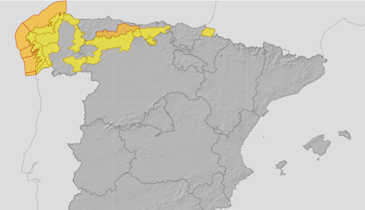 CGAL: A CORUÑA, por riesgo de Lluvias (a partir 22h.) y Vientos. LUGO y OURENSE, por riesgo de Vientos. PONTEVEDRA, por riesgo de Lluvias (a partir 22h.), Fenómenos Costeros Adversos (hasta 20h.) y Vientos.